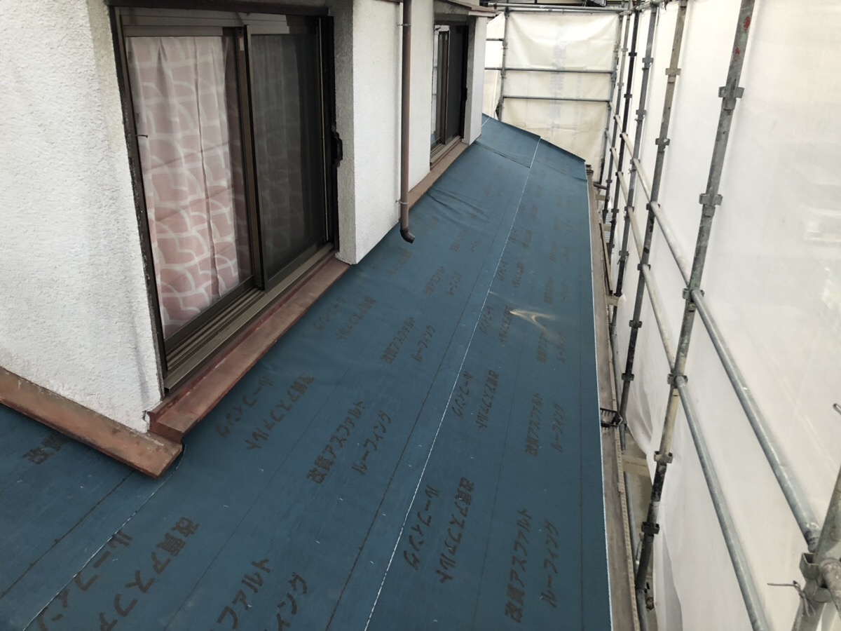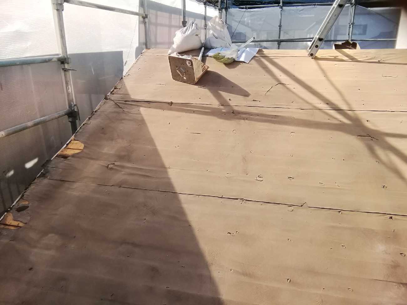 瓦をはぐると既存の防水シートが出てきましたので、その上から新しい防水シートを施工していきます。