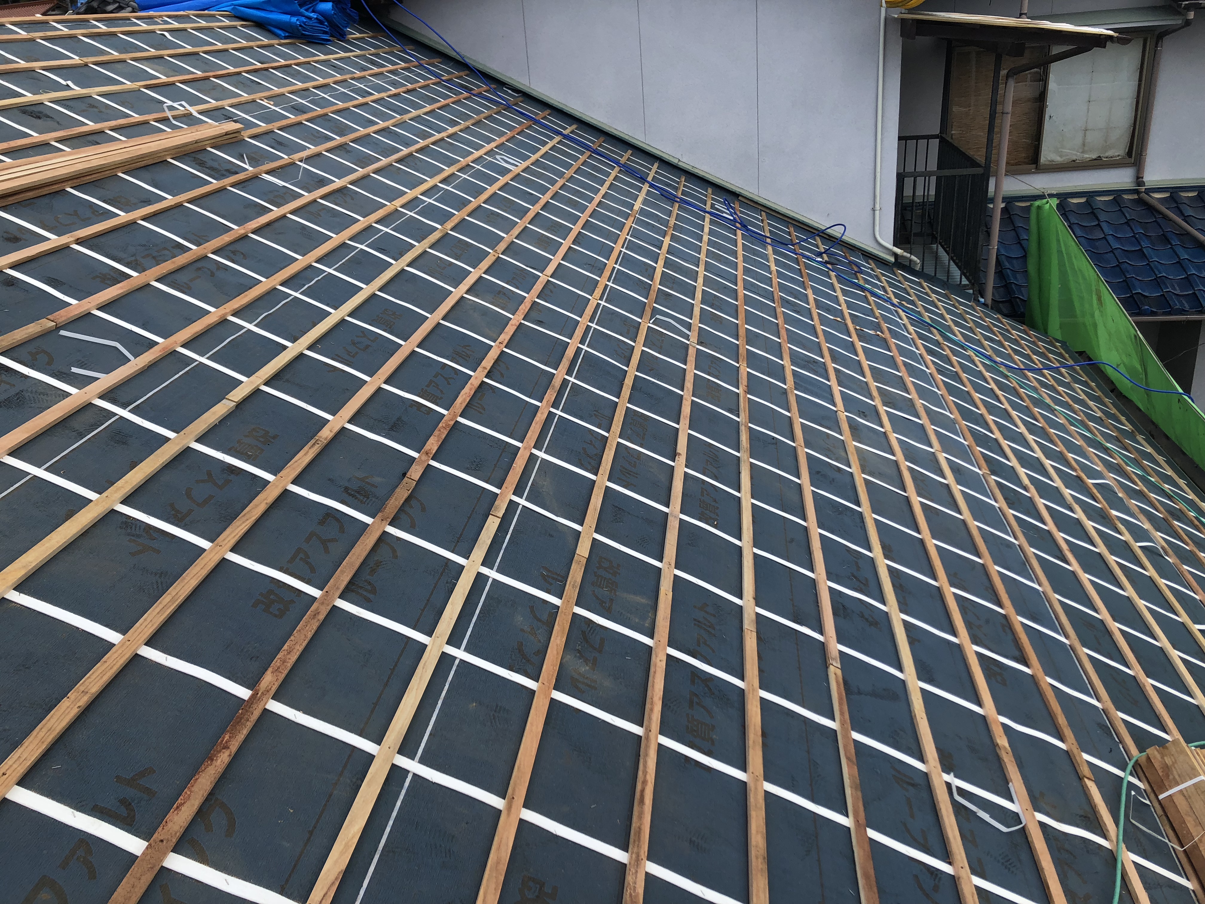 今回は瓦の葺いていくために瓦を留める桟木と言われる木材を取り付け行う工程になります。