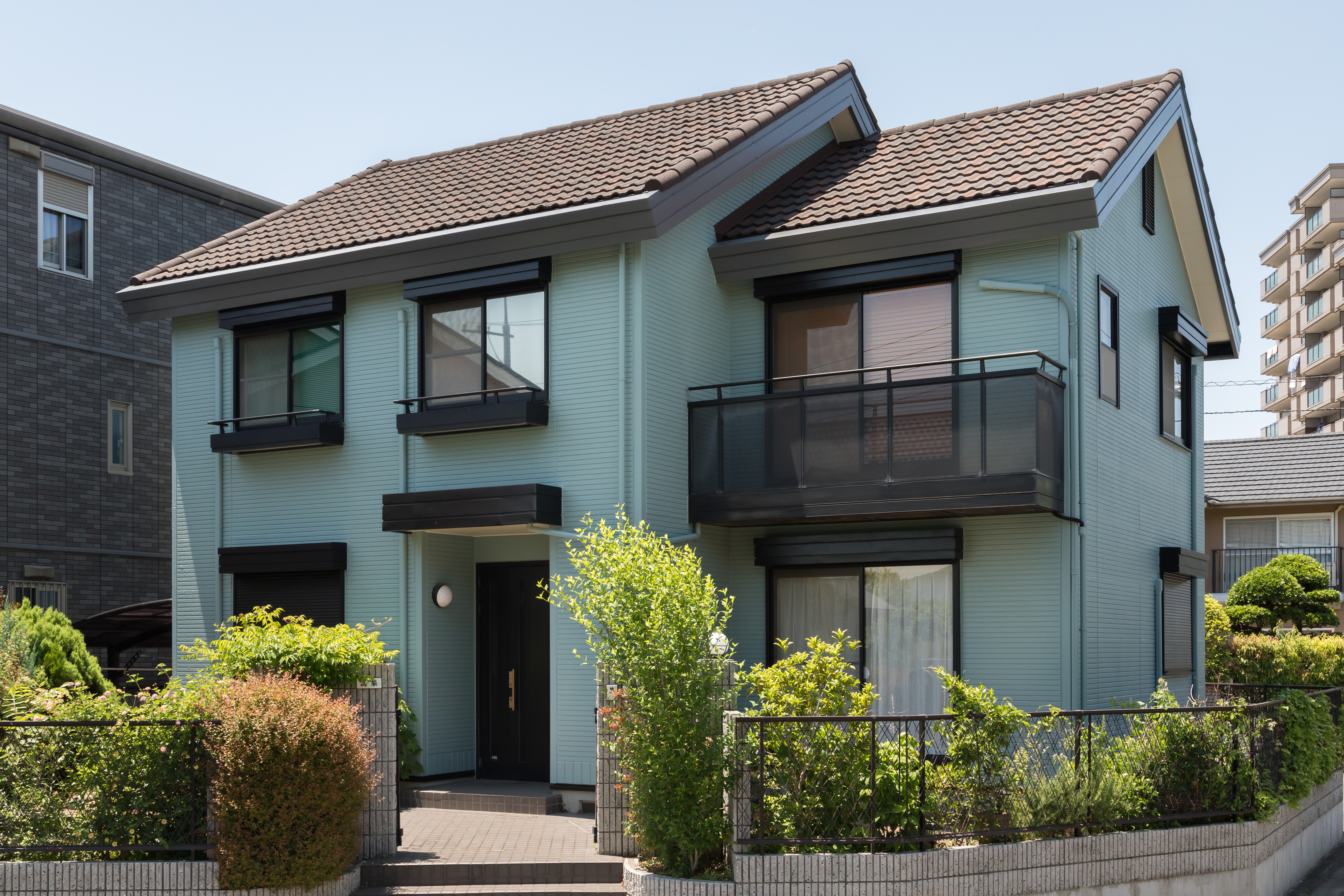 外壁は寒色、屋根はブラウンの屋根でカバーを行ないました!